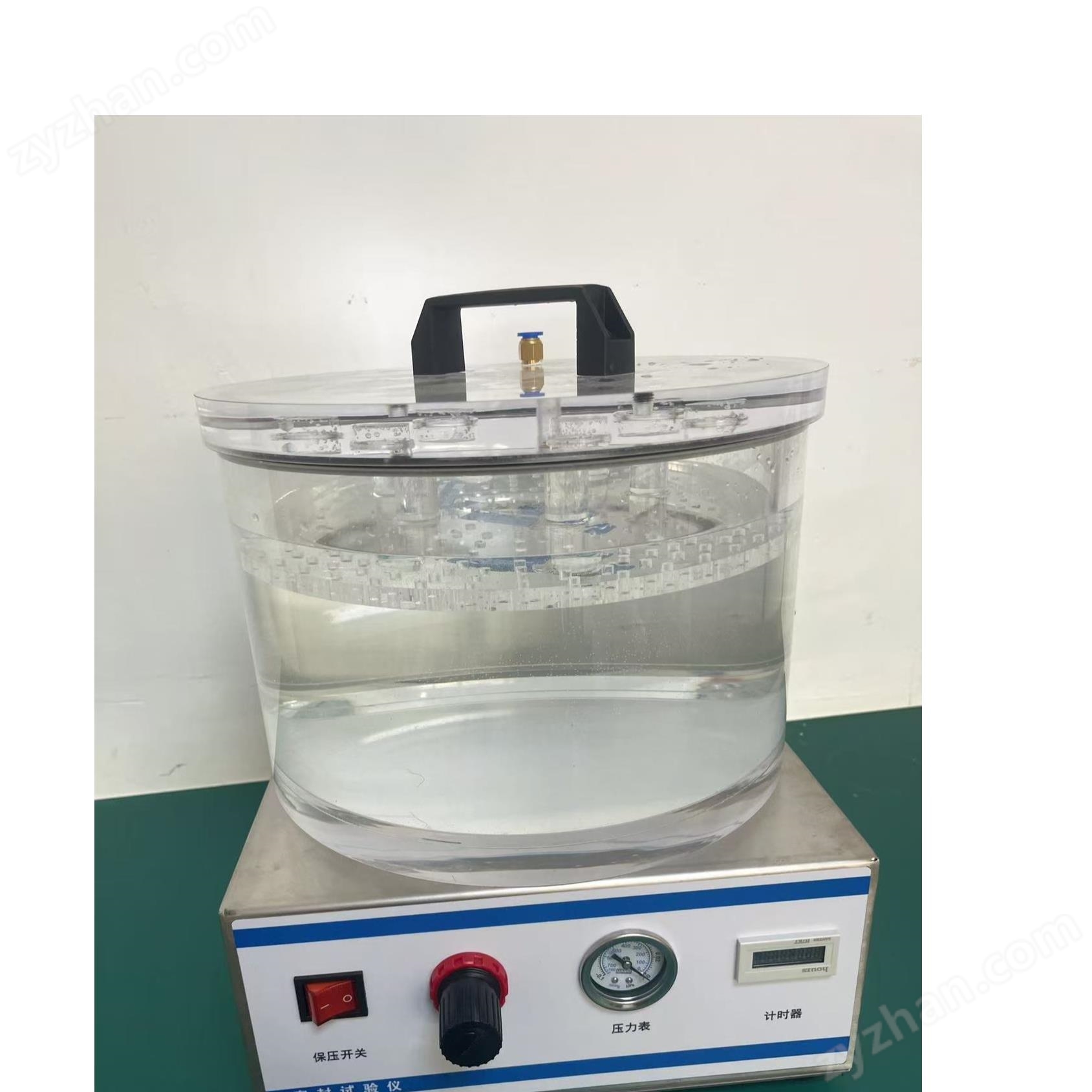 通過(guò)對(duì)真空室抽真空,使浸在水中的試樣產(chǎn)生內(nèi)外壓差,觀測(cè)試樣內(nèi)氣體外逸情況,以此判定試樣的密封性能;通過(guò)對(duì)真空室抽真空,使試樣產(chǎn)生內(nèi)外壓差,觀測(cè)試樣膨脹及釋放真空后試樣形狀恢復(fù)情況,以此判定試樣的密封性能。